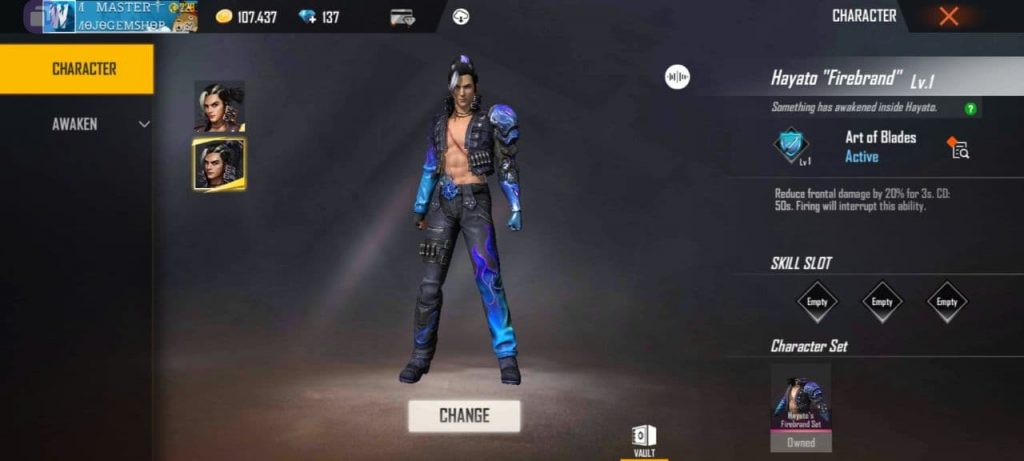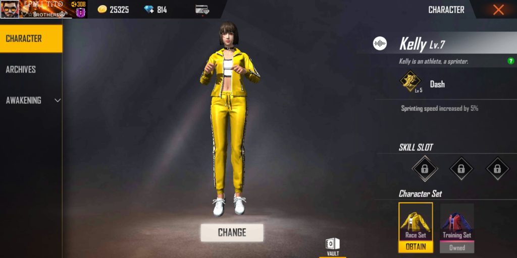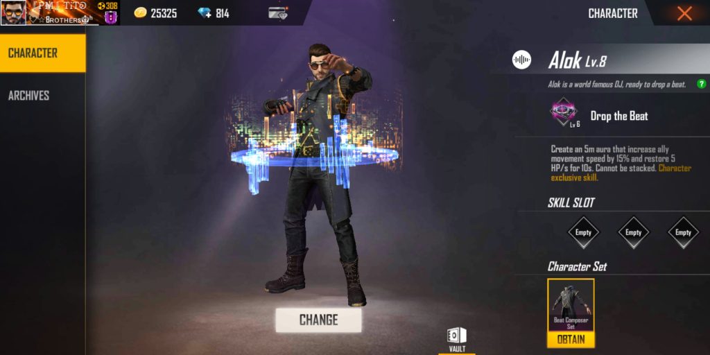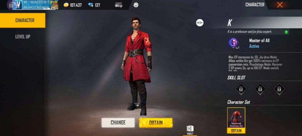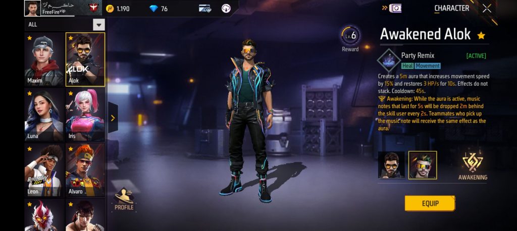 با زدن دکمه ی این شخصیت یک محوطه دور خود میسازد که میتواند تا 600 دمیج را دفع کند.از داخل محوطه میشود به بیرون تیر زد.سرعت راه رفتن 15 درصد افزایش پیدا میکند.(بیشترین سرعت در فری فایر)یار های شما هم اگر درون محوطه باشند 15 درصد افزایش سرعت پیدا میکنند.تمام این قابلیت ها تا 9 ثانیه باقی میماند و فرصت استفاده از دکمه هر40 ثانیه یکبار است