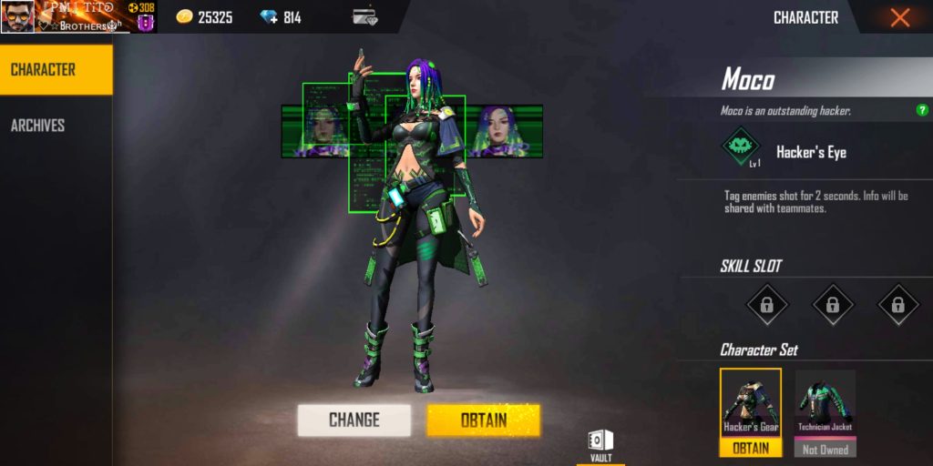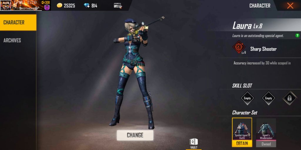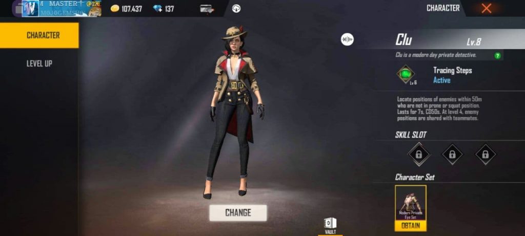 با زدن دکمه این شخصیت نشان دادن جای دشمنان در محوطه 50 متری (در صورتی که دراز کشیده نباشند) 7 ثانیه ادامه دارد و هر 50 ثانیه میتوانید از قدرتش استفاده کنید. در سطح 4 جای دشمنان علاوه بر نشان دادن به شما به هم تیمی هایتان هم نشان داده میشود